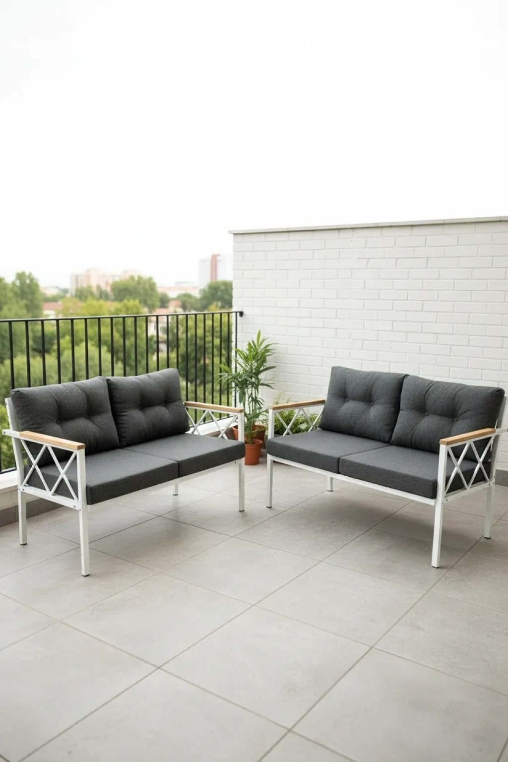 İki adet koltuk içeren oturma grubu, balkon, bahçe ve kafe gibi açık alanlarınızda konforlu bir oturma deneyimi sunar; Dayanıklı metal malzeme kullanımı sayesinde uzun ömürlü ve sağlam bir yapıya sahiptir, ; Beyaz profil demir tasarımı ile modern ve şık bir görünüm sağlar, mekanınıza estetik bir dokunuş katar; Ofis koltuk takımı olarak da kullanılabilme özelliği ile iş yerlerinizde de rahatlıkla tercih edilebilir;