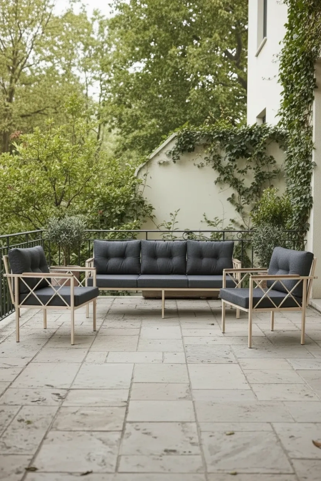3+1+1 balkon,bahçe mobilyası ; Üçlü: 173x88cm derinlik 65cm, ; Tekli koltuk 63x88cm, ; Oturma yükseklik 45cm, ; Metal gövde statik fırın boyalı 30x20mm profil iskelet et kalınlık 0.90mm, ; Oturma minderi sünger 9cm 22 danste, sırt kırpık sünger dolgulu, ; Kumaş 1.kalite fermuarlı keten ; Kollar gürgen ağaç ; Demonte ; masa dahil değildir ;