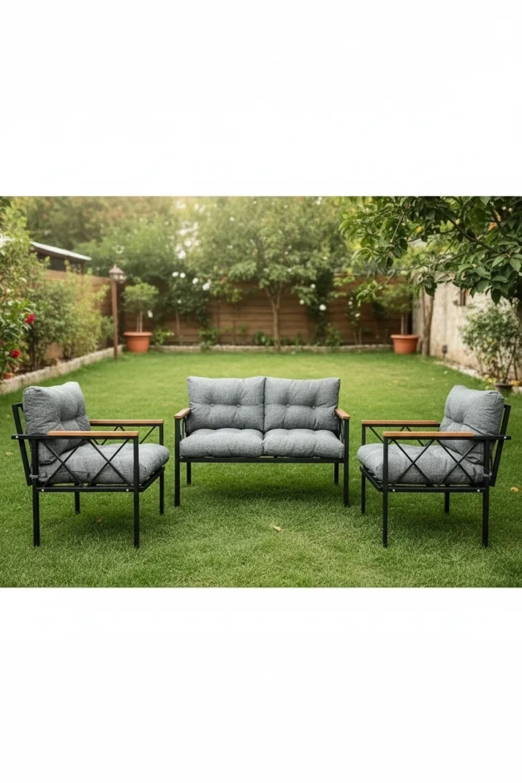 Özel tasarım oturma grubunda yer alan tekli koltuk 63x88 cm ölçülerinde üretilir. İkili koltuğu 120x88 cm ölçülerine sahiptir.; Her detayında özenle seçilmiş malzemeler ve estetik bir tasarım, oturma deneyiminizi yükseltir. Takımda yer alan koltukların derinlikleri 65 şeklindedir.; Döşemelerde kullanılan fermuarlı kumaşlar, sadece şıklıkla kalmayıp aynı zamanda temizlik konusunda da kolaylık sunar. Pratik bir temizlik süreciyle oturma grubunuzu her zaman ilk günkü gibi canlı tutabilirsiniz.; Takım, demonte olarak gönderilir. Kısa süre içinde kullanıma hazır hale getirebilirsiniz.; Metal malzeme kullanılan oturma grubu, gri renk tonu ile modern tasarım anlayışını yansıtır.; Oturma yüksekliği 45 cm olan model; konforlu bir deneyim vadeder. ; Düğmelerin arkasında yer alan ipleri kesip minderlerin kılıflarını kolayca çıkarmak mümkündür. Dilerseniz kılıfları çamaşır makinesinde de yıkayabilirsiniz.; İkili koltuk 300 kg kadar taşıma kapasitesi sunar. Berjerin maksimum taşıma kapasitesi ise 150 kg olarak belirtilir.; Üretiminde 0.90 mm profiller kullanılmıştır. Bu sayede son derece uzun ömürlü şekilde kullanmak mümkündür.; Sırt profil iskeleti menteşeli şekilde gelir. Sadece kollarını takarak kurulumu tamamlamak mümkündür.; Temizliğini nemli bir bezle yapabilirsiniz.; İdeal oranda yerden yüksek olduğu için altını rahat biçimde temizlemek mümkündür.;