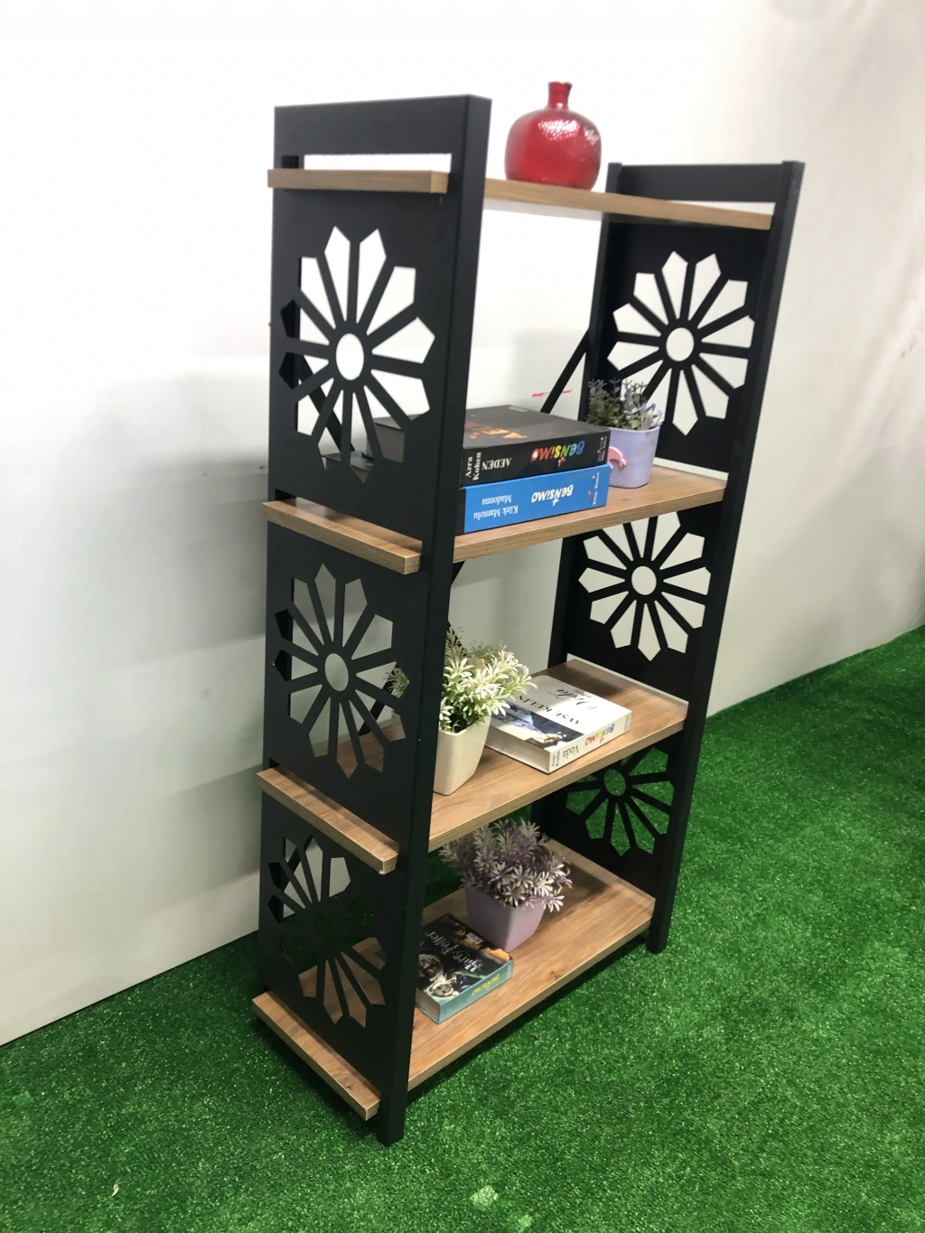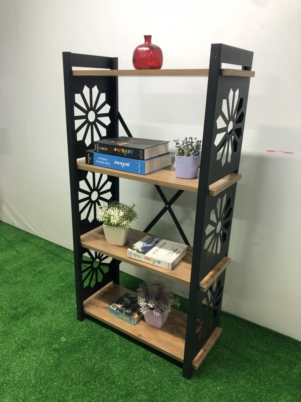 Dayanıklı metal malzeme kullanımı, uzun ömürlü ve sağlam bir yapı sunar; Lazer kesim teknolojisi ile üretilen desenler, modern ve şık bir görünüm kazandırır; 4'li raf tasarımı, kitaplarınızdan süs eşyalarınıza kadar çeşitli eşyalarınızı düzenli bir şekilde saklamanız için idealdir; Çiçeklik olarak da kullanılabilme özelliği ile mekanınıza doğal bir dokunuş katar; Kitaplık olarak tasarlanmış yapısı sayesinde kitaplarınız için geniş depolama alanı sağlar;