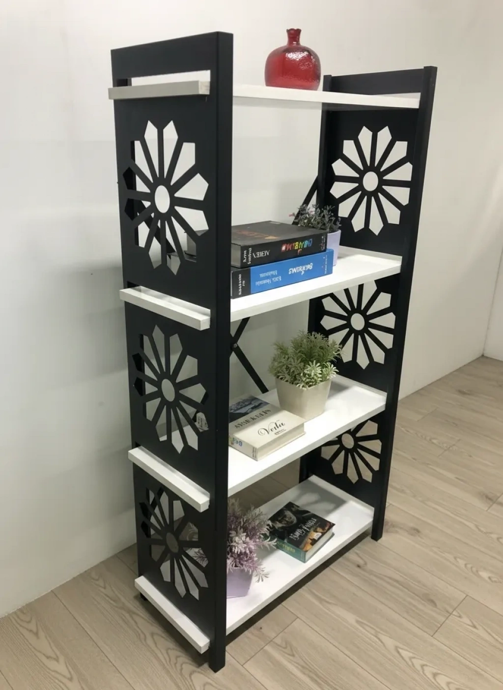 Dayanıklı metal malzeme kullanımı, uzun ömürlü ve sağlam bir yapı sunar; Lazer kesim teknolojisi ile üretilen desenler, modern ve şık bir görünüm kazandırır; 4'li raf tasarımı, kitaplarınızdan süs eşyalarınıza kadar çeşitli eşyalarınızı düzenli bir şekilde saklamanız için idealdir; Çiçeklik olarak da kullanılabilme özelliği ile mekanınıza doğal bir dokunuş katar; Kitaplık olarak tasarlanmış yapısı sayesinde kitaplarınız için geniş depolama alanı sağlar;