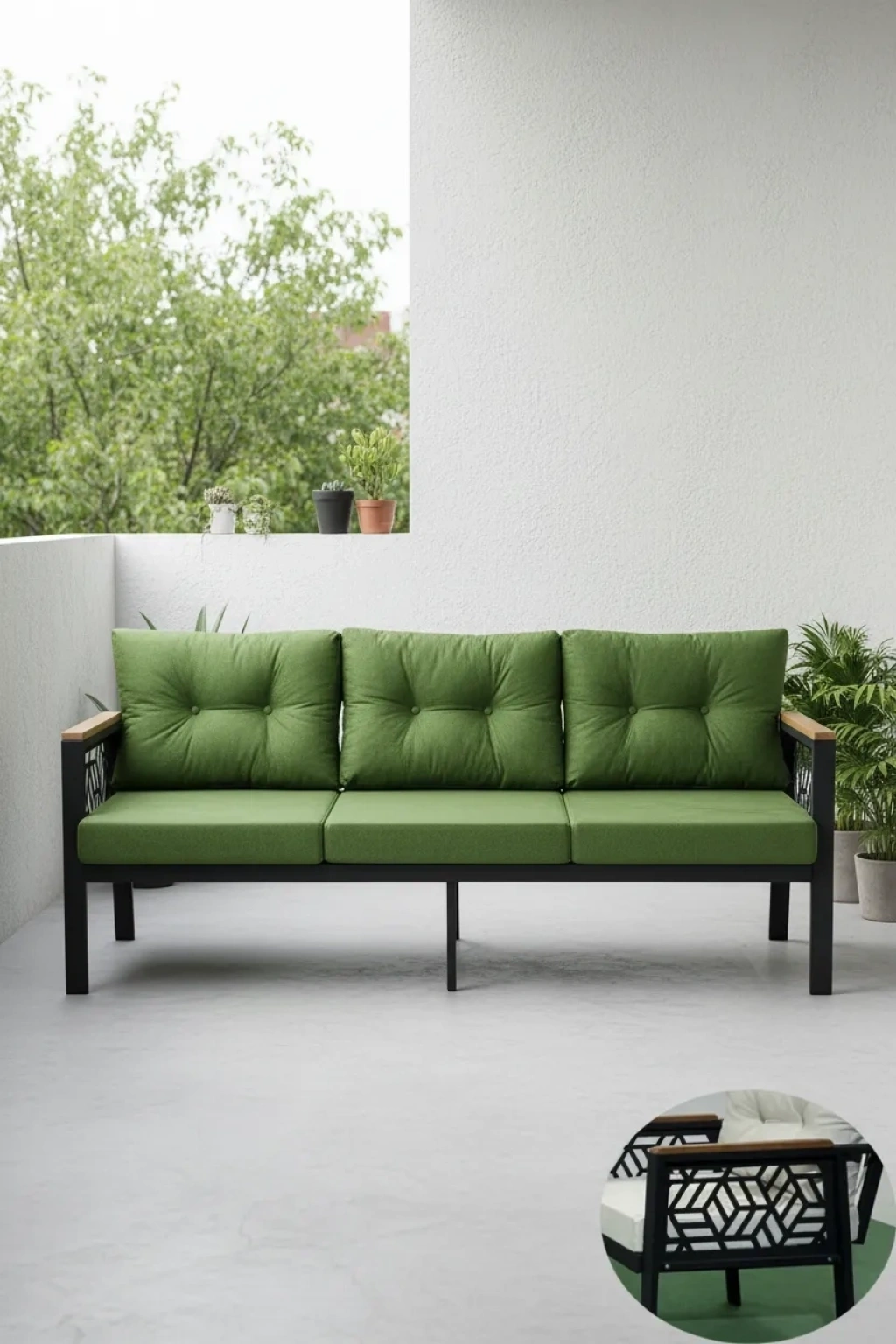 Oturma grubu olarak tasarlanmış olup, balkon, bahçe ve kafe gibi açık alanlarda konforlu bir oturma deneyimi sağlar