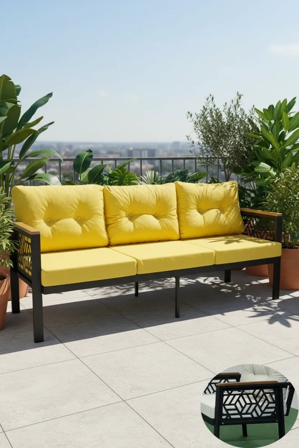Oturma grubu olarak tasarlanmış olup, balkon, bahçe ve kafe gibi açık alanlarda konforlu bir oturma deneyimi sağlar