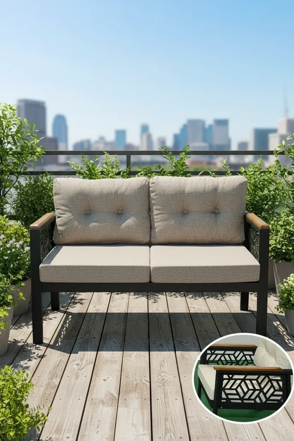 Balkon ve bahçe gibi dış mekanlarda kullanıma uygun, modern tasarımıyla dikkat çeken bir oturma takımı; Metal malzeme kullanımı sayesinde dayanıklılık ve uzun ömürlü kullanım sunar; Modern stil sahibi tasarımıyla mekanınıza şık bir görünüm kazandırır; 2 kişilik oturma kapasitesiyle misafirlerinizi rahatça ağırlamanız için idealdir;
