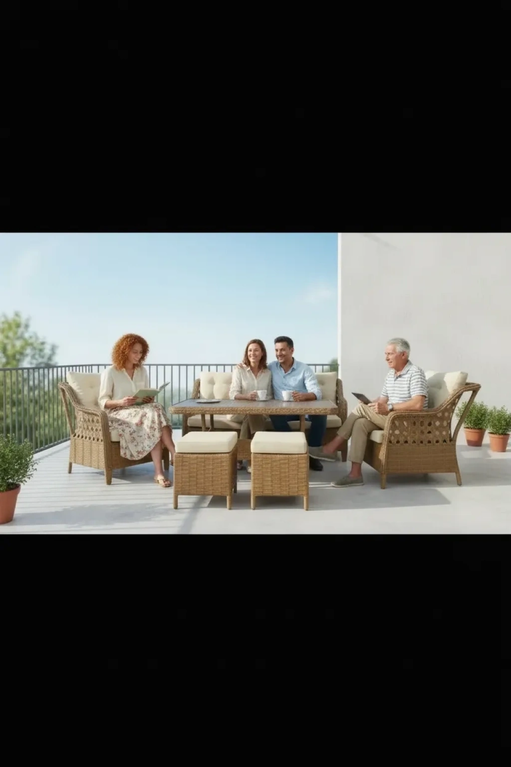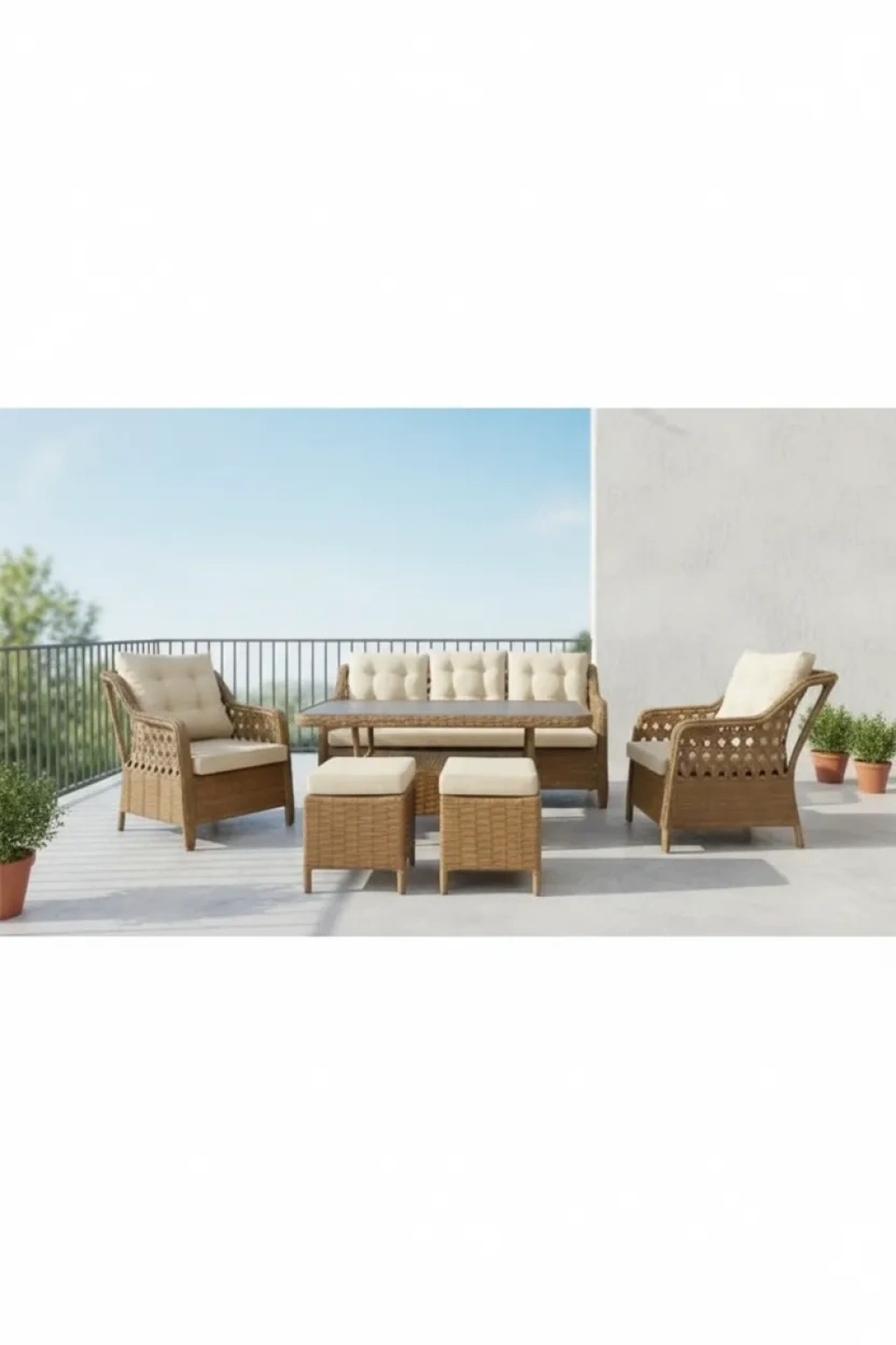 - Dayanıklı metal gövde yapısı ile uzun ömürlü kullanım sunar; - 7 kişilik oturma kapasitesiyle geniş aileler ve arkadaş grupları için idealdir; - Rattan masa ve puf detayları, doğal dokunuşlarla bahçe ve balkon dekorasyonunuza estetik bir katkı sağlar; - Kolay temizlenebilir yüzeyi sayesinde pratik kullanım imkanı sunar;